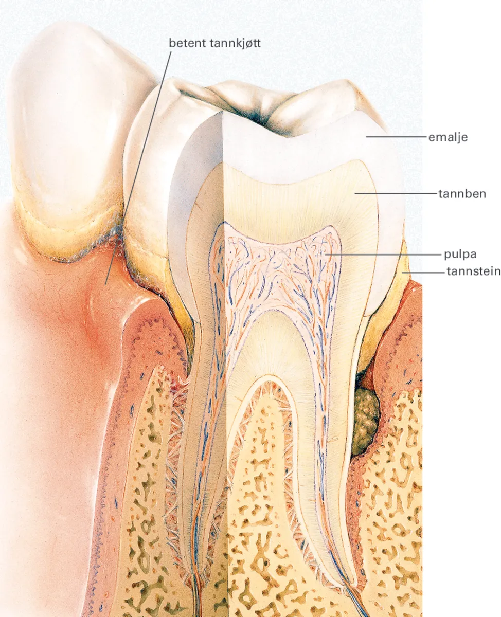 Periodontitt er tannkjøttbetennelse som har spredt seg til de dypere vevene, det vil si ned rundt tannroten.